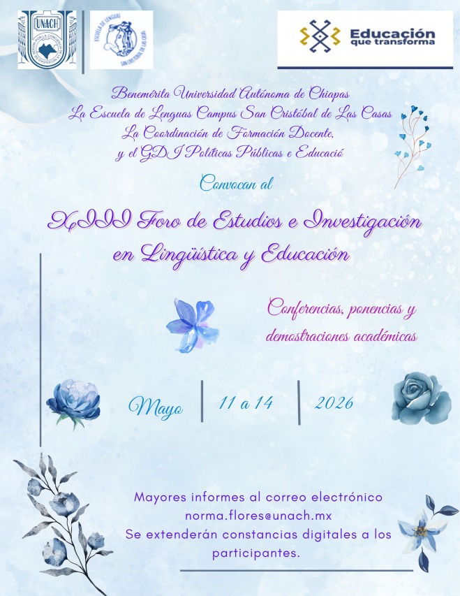 La Benemérita Universidad Autónoma de Chiapas invita a la comunidad estudiantil al XIII Foro de Estudios e Investigación en Lingüística y Educación, que se realizará del 11 al 14 de mayo de 2026.